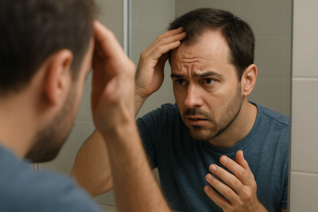 Para os homens, o processo de queda capilar é mais intenso e acomete principalmente a região frontal e a coroa. Nas mulheres, o mais frequente é afetar o centro do couro cabeludo.